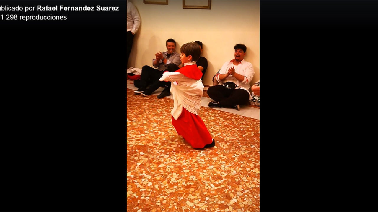 En el documento gráfico se ve a un niño vestido de monaguillo que espera la salida del Prendimiento y lo hace por bulerías. El pequeño derrocha arte bailando al son de varios cantos y palmas flamencas.
