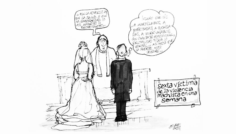 La viñeta de Alfredo Boto-Hervás muestra a un pareja que está en el altar a punto de casarse. El cura les dice que deben amarse "en la adversidad, en la salud y en la enfermedad, amarse y respetarse". A lo que el hombre contesta: "¡Claro que si!. A martillazos, a bofetadas, a cuchilladas, con chantaje emocional, brutalidad física y verbal, así hasta que la muerte nos separe".