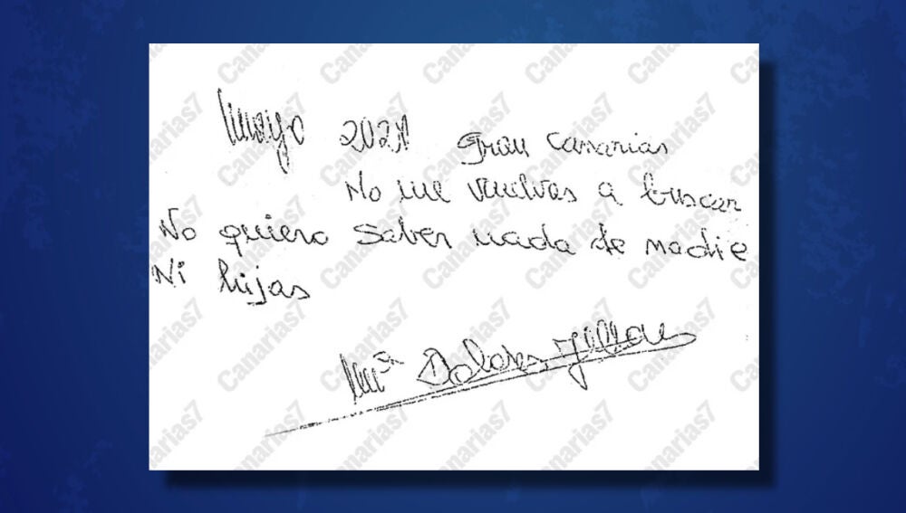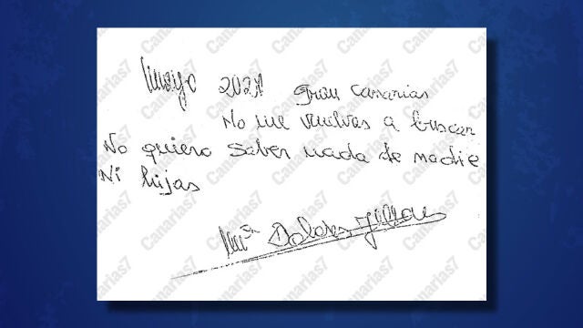 Fue en ese momento cuando presentó una supuesta carta de María Dolores, a modo de coartada, en la que pedía que la olvidaran tanto él como sus hijas. En el manuscrito, publicado por el diario Canarias 7, se puede leer: "No me vuelvas a buscar. No quiero saber nada de nadie, ni hijas". La carta lleva fecha de mayo de 2021 y la firma de María Dolores, pero cuatro años después se demostró que era una falsificación y que la había escrito él mismo de su puño y letra para tratar de encubrir el crimen.