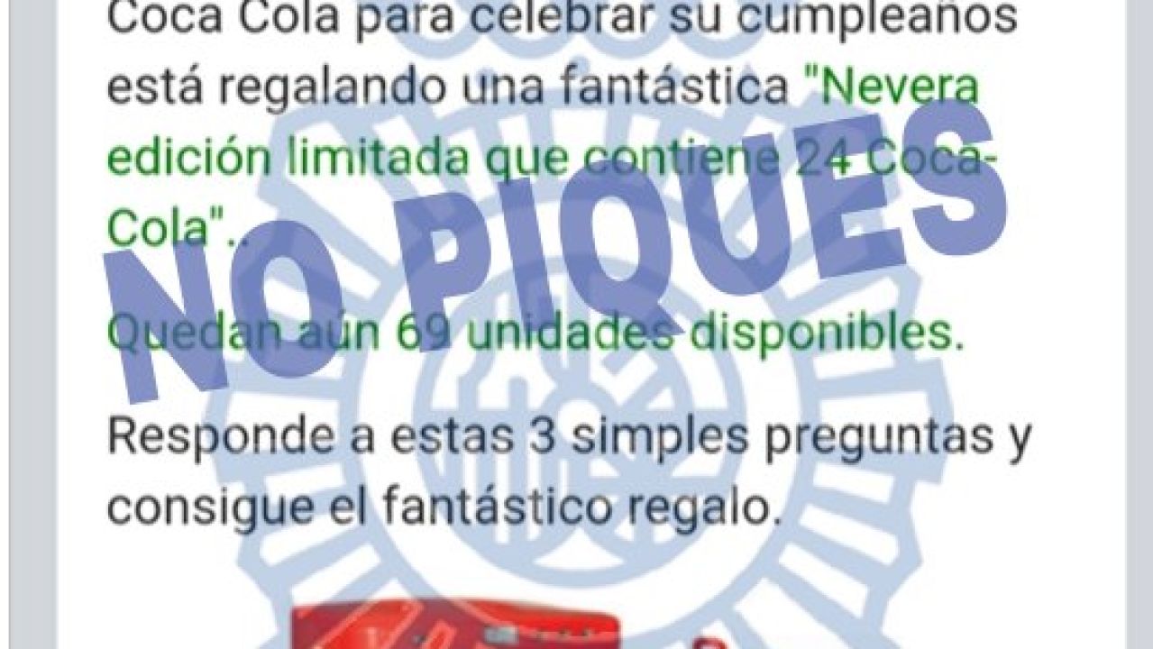 La policía ha alertado de un delito de phishing en Whatsapp en el que nos intentan robar los datos a través de un mensaje falso, que nos ofrece unas neveras llenas de Coca-Cola.