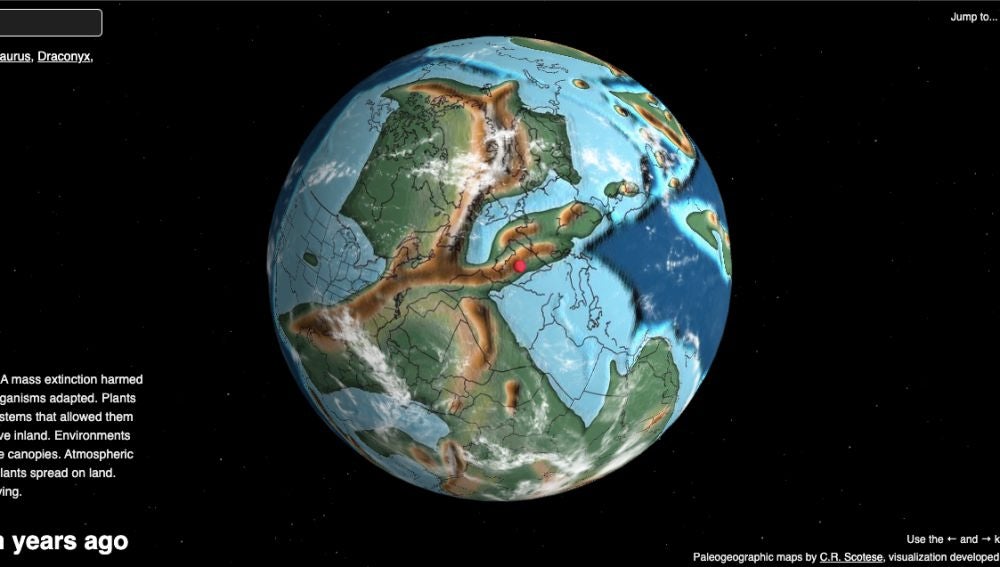 El mapa interactivo, que podrás consultar en 'dinosaurpictures.org/ancient-earth', además de mostrarte dónde se ubicaban antiguamente las ciudades, cuenta con un apartado que aporta información sobre el periodo al que corresponde el año que has seleccionado.
