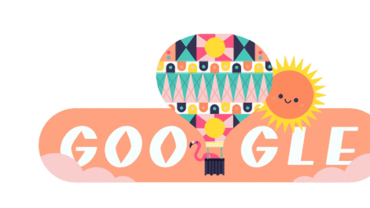 Google ha decidido celebrar la llegada del verano con un doodle. En la imagen se ve un globo aerostático con un flamenco encima, situado frente a un sol sonriente.