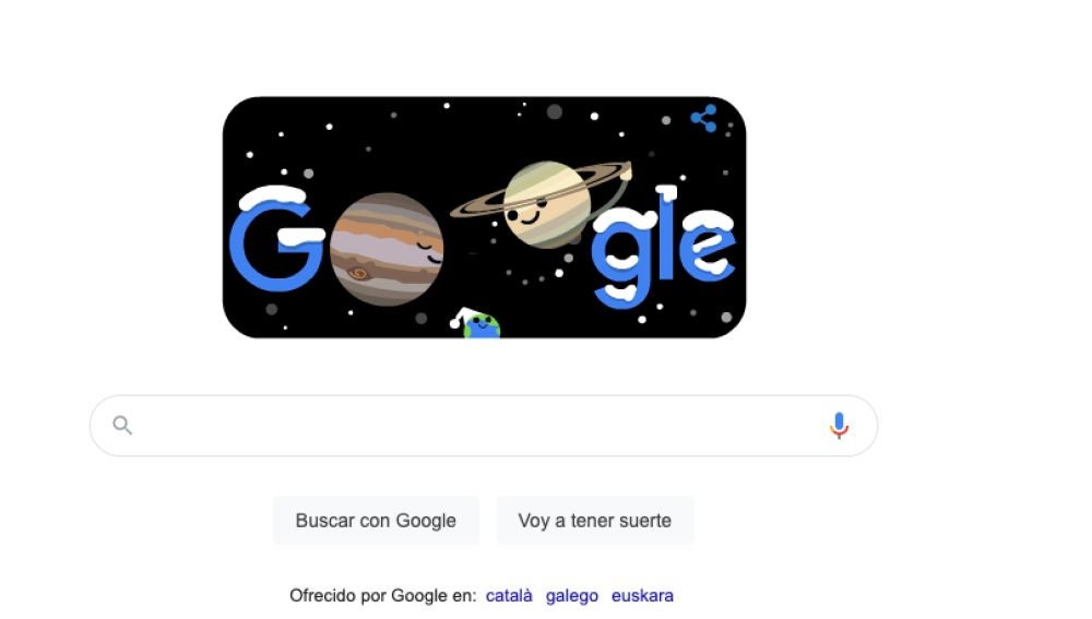 En el doodle de hoy se muestra una noche con nieve en la que las letras del gigante de los buscadores aparecen de color azul, color del frío y cubiertas con un manto de nieve mientras que las dos 'o' del nombre de Google se han convertido en Júpiter y Saturno que se saludan en el mismo punto de mirada.