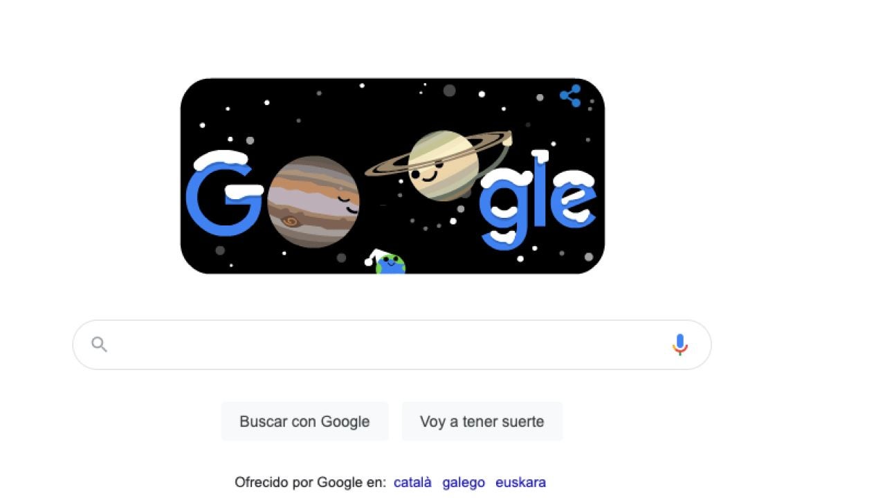 Doodle ha querido dar la bienvenida al invierno con uno de sus doodles. El gigante de los buscadores homenajea así la llegada de la estación del frío que pone fin a un año marcado por la pandemia del coronavirus y por otro un fenómeno conocido como la Gran Conjunción entre Júpiter y Saturno que no se repetirá hasta el año 2080.