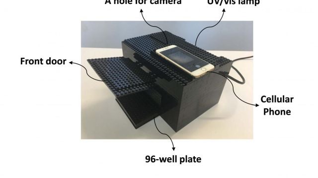 El diseño de este sistema presenta una caja formada con bloques de Lego; un teléfono inteligente que actúa como la cámara del instrumento; una lámpara de radiación ultravioleta (UV); y una microplaca de 96 pocillos (habitualmente usada en los laboratorios científicos).