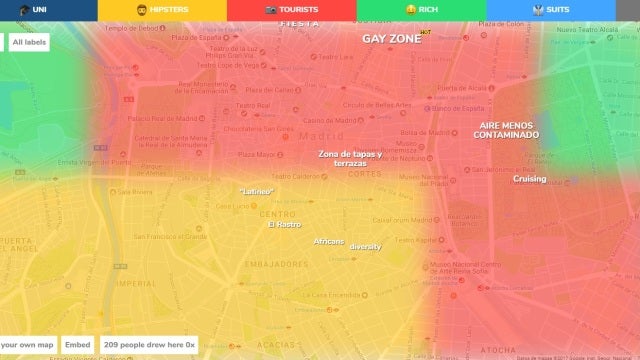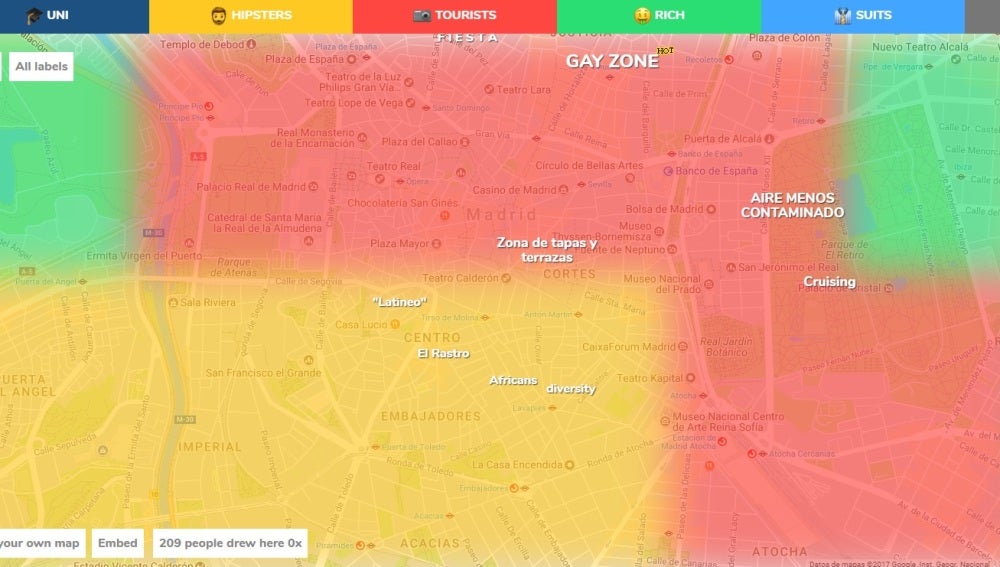El mapa permite a los usuarios catalogar, ubicar y colorear sobre el mapa las categorías más curiosas. Por el momento se pueden diferenciar entre 'hipsters', ricos, turistas, ejecutivos, turistas, universitarios o normales. Al ser una aplicación colaborativa, hace que el mapa se esté convirtiendo en uno de los más divertidos a la vez que completos.
