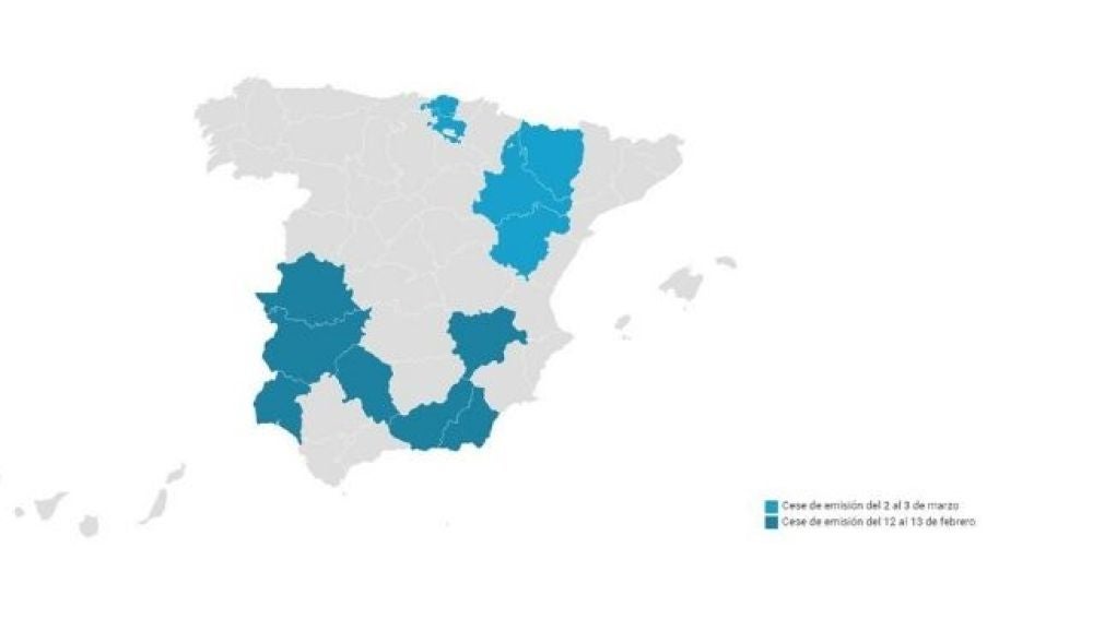 Este 3 de marzo continua el apagón de la Televisión Digital Terrestre (TDT) con su tercera fase que afectará a las localidades de Álava, Teruel, Vizcaya Este y Oeste y Zaragoza Norte y Sur. El cese de las emisiones ya se ha producido en Albacete, Almería -Norte y Sur-, Badajoz Este, Cáceres Norte, Córdoba Norte y Sur, Granada Este, Oeste y Sur, Huelva Norte y Sur y Málaga y el próximo 30 de junio se completará el apagón en las zonas restantes.