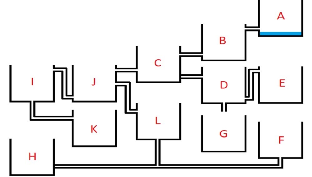 Solución: el depósito que se llena primero es el 'F'. El agua pasa por el depósito 'A', 'B' y 'C'. El tanque 'D' al estar cerrado, hace que el agua siga por el 'J' y el 'L'. Como el 'H' también está cerrado, el 'F' se llena primero.
