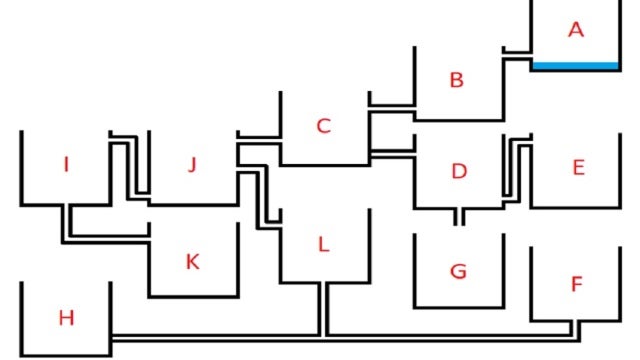 Parece fácil, pero no muchos llegan a la solución correcta. Para adivinar este reto viral hay que fijarse bien en las conexiones entre los doce contenedores. El grifo comienza a llenar de agua el 'A' y de este pasa al resto. ¿Qué contenedor se llena antes?