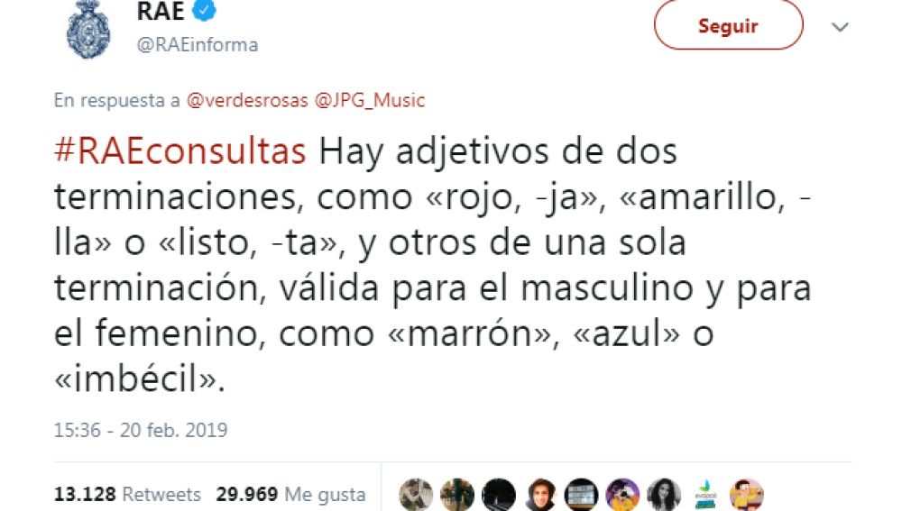 A la cuestión, la institución respondió que: "#RAEconsultas Hay adjetivos de dos terminaciones, como 'rojo, -ja', 'amarillo, -lla' o 'listo, -ta', y otros de una sola terminación, válida para el masculino y para el femenino, como 'marrón', 'azul' o 'imbécil'".