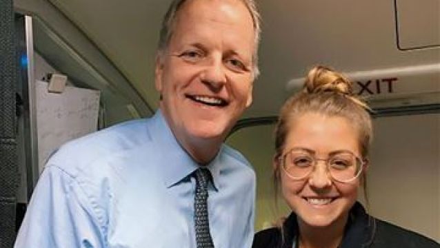 Maddie Peters y el resto de la tripulación de American Airlines estaban avisados que el CEO, Doug Parker, volaría con ellos. Tras dar un traspié, la joven acabó derramando sobre su jefe una bandeja llena de bebidas.