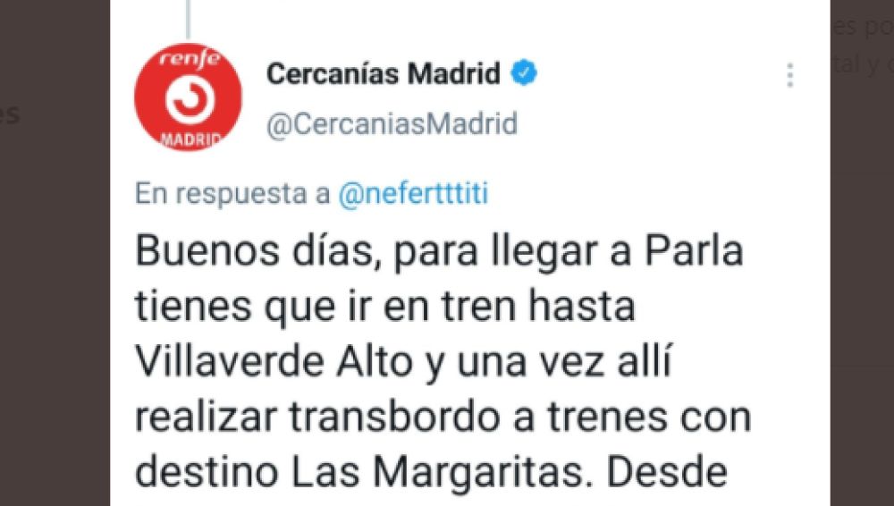 "Buenos días, para llegar a Parla tiene que ir en tren hasta Villaverde Alto y una vez allí realizar transbordo a trenes con destino Las Margaritas. Desde Las Margaritas un autobús con destino Getafe Sector Tres y allí, finalmente, un tren lanzadera hasta Parla. Un saludo", fue la respuesta de Cercanías Madrid.