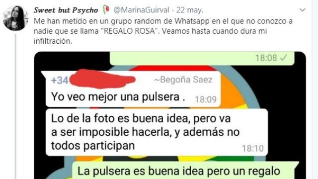 La joven descubrió que le habían metido en un grupo de Whatsapp de madres llamado 'Regalo Rosa', donde buscaban un detalle para la profesora de sus hijos. La tuitera intentó sabotear el regalo, pero acabó hablando durante días con unas de las madres, a la que finalmente le confesó la verdad.