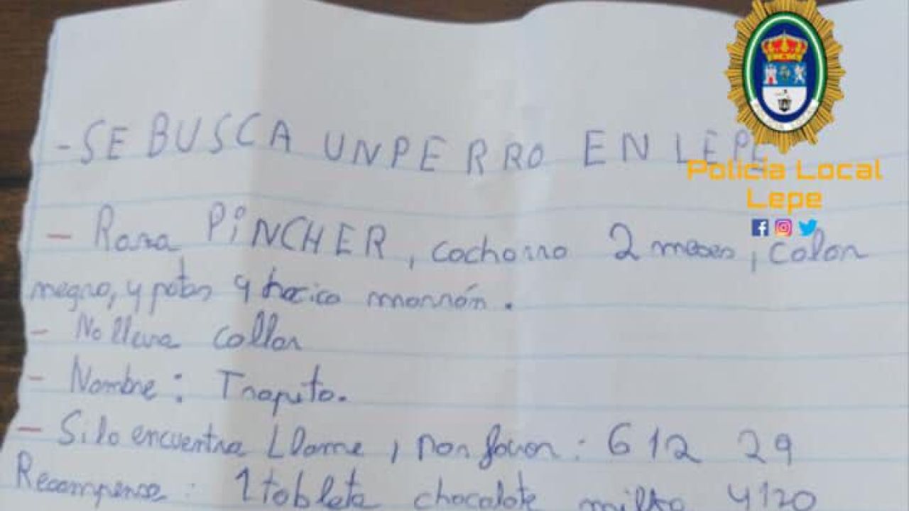 Una niña de Lepe, en Huelva, hace una llamada de socorro para que le ayuden a encontrar a su perro perdido y ofrece una tableta de chocolate como recompensa.