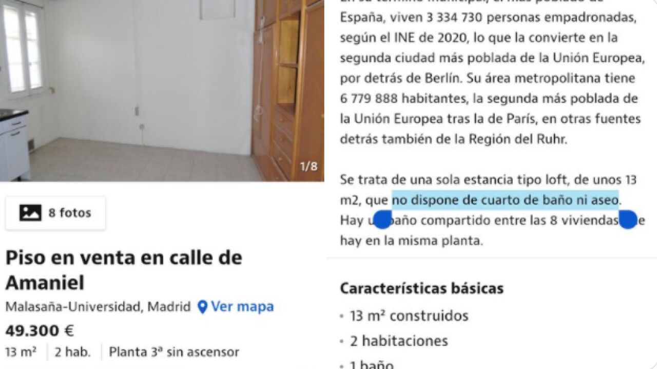 Asimismo, entre las características más destacadas es que "no dispone de cuarto de baño ni aseo", pero, para aquel inquilino que no quiera tener que lavarse con cubos y por partes en la cocina, siempre queda el "baño compartido" que hay "entre las ocho viviendas que hay en la misma planta".
