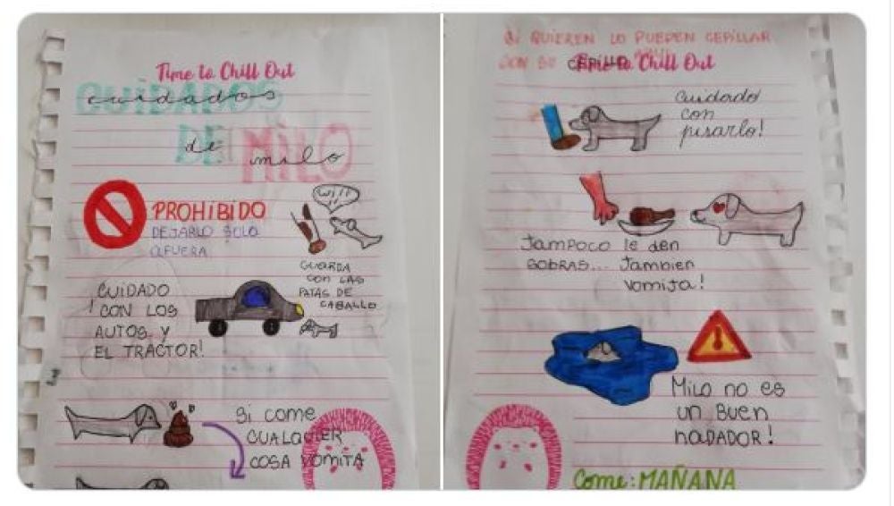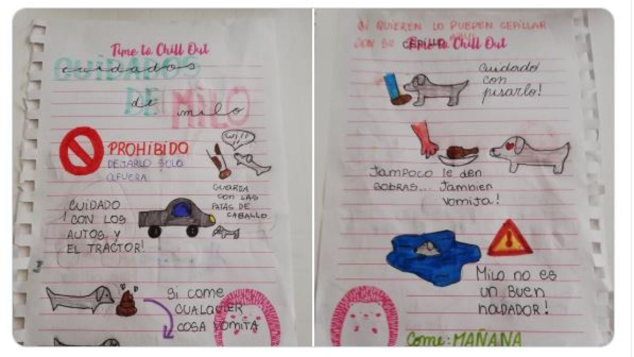 Cuidado con pisarle, prohibido dejarlo solo en la calle o cuidado con los autos son algunas de las advertencias que la niña dibujó en el manual de instrucciones para cuidar a Milo.