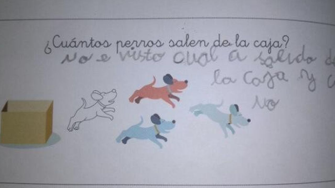 Se trata nada más y nada menos que de la respuesta de un niño ante un simple ejercicio del colegio. En el ejercicio se preguntaba "¿Cuántos perros salen de la caja?". El alumno respondió: "No he visto cuál ha salido de la caja y cuál no".