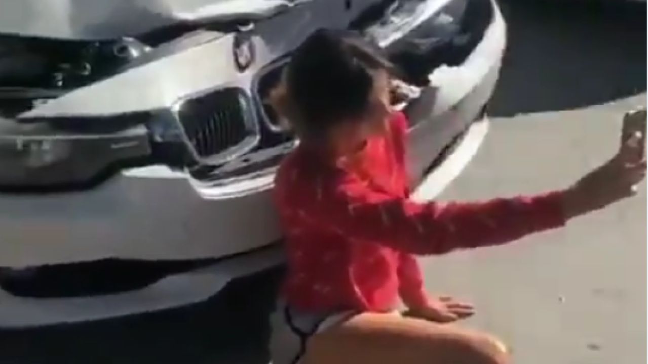 Un usuario de Twitter publicó en su cuenta un vídeo en el que una joven salía haciéndose un 'selfie' después de haber sufrido un aparatoso accidente. Se puede apreciar cómo la chica se apoya en el suelo de espaldas al vehículo, el cual aparece con el morro completamente destrozado.