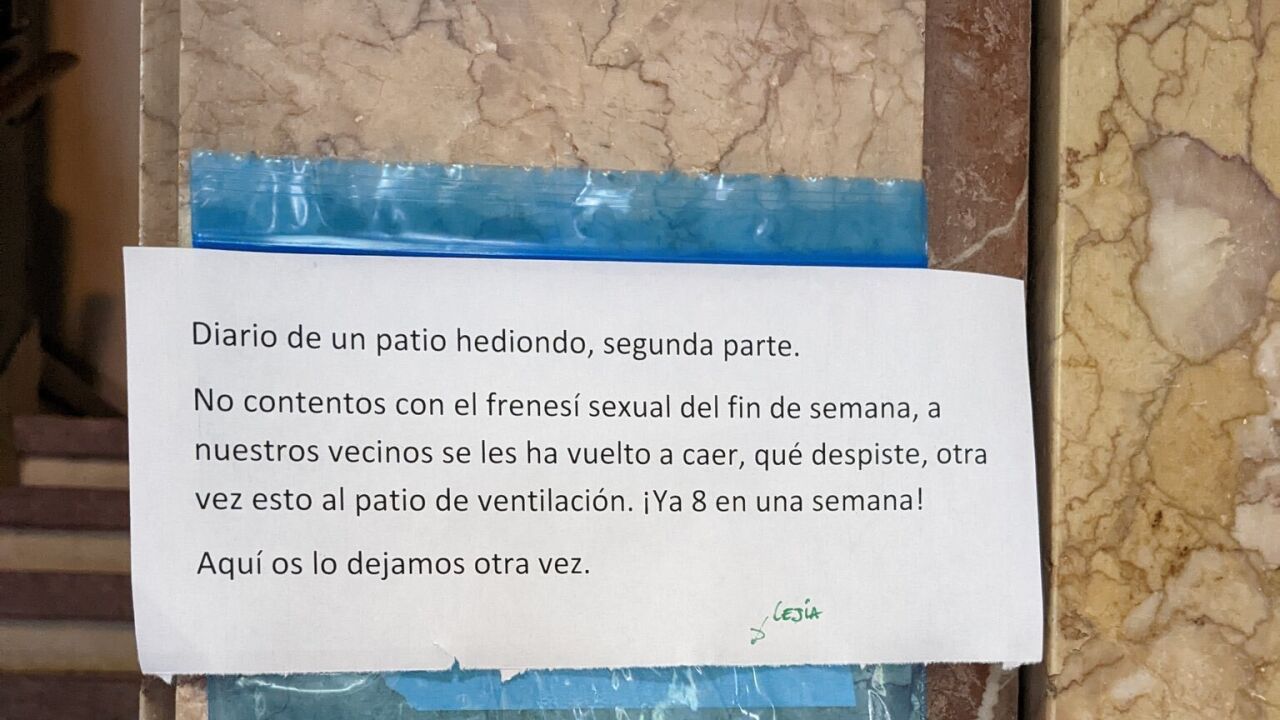 Pero aquí no acaba la historia. Poco después colgaron otra nota: "Diario de un patio hediondo, segunda parte. No contentos con el frenesí sexual del fin de semana, a nuestros vecinos se les ha vuelto a caer, qué despiste, otra vez esto al patio de ventilación... ¡Y ocho en una semana! Aquí os lo dejamos otra vez".