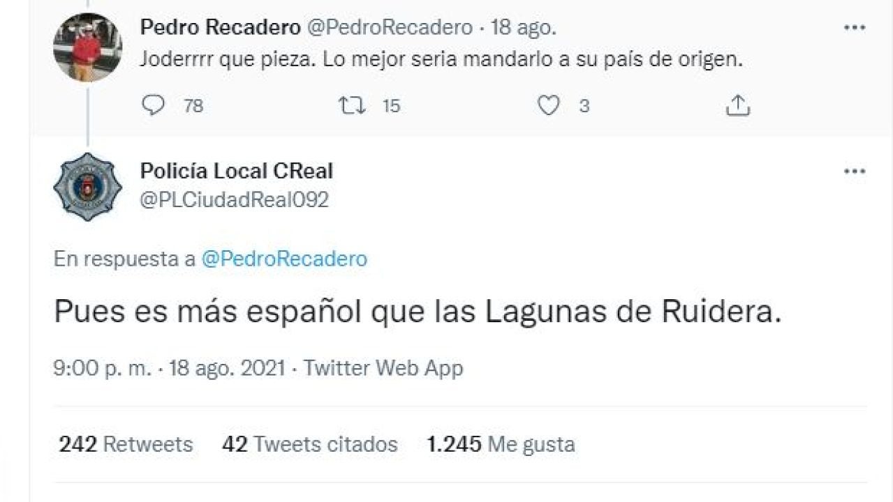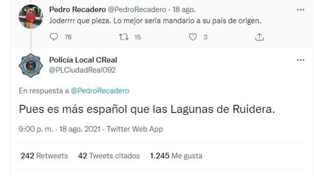 Un usuario en redes comentó la publicación pidiendo que deportaran a ese menor a su país de origen. Un comentario racista que fue contestado con contundencia por parte de la Policía Local: "Pues es más español que las Lagunas de Ruidera". La respuesta de los agentes se ha hecho viral en Twitter y cientos de personas han aplaudido el mensaje de los agentes.