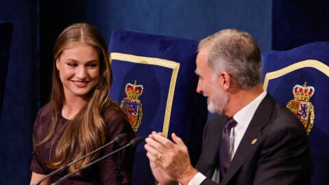El rey Felipe ha hablado emocionado durante su discurso en los Premios Princesa de Asturias cuando se ha dirigido a la princesa Leonor para decir que ha llegado el momento de ir cediéndole el testigo.
