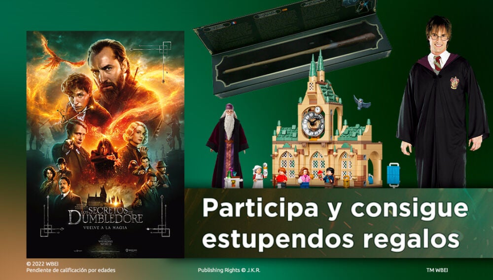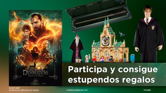 - Tenemos un pack de estupendos regalos: Un set de LEGO del hospital de Hogwarts, la varita de Newt Scamander, un disfraz de Gryffindor (tamaño adulto) y una figura de Dumbledore.