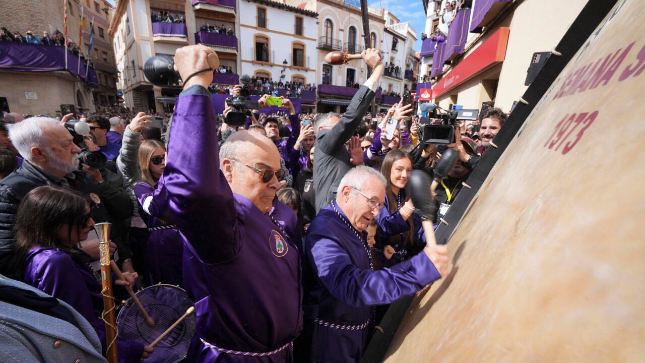 El acto se ha adelantado unos minutos respecto a lo previsto y, tras la señal inicial, miles de tambores y bombos han roto el silencio en la localidad turolense, en un estruendo colectivo que se ha extendido entre los participantes ataviados con túnica y tercerol morado.