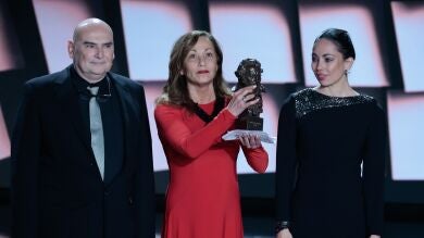 Antonio y Anna Saura, hijos de Carlos Saura, han recogido su Goya de Honor junto a su compañera Lali Ramón. Muy emocionados por el apoyo que han recibido en los últimos días tras el fallecimiento del veterano actor, del que han leído sus últimas palabras dedicadas al público.
