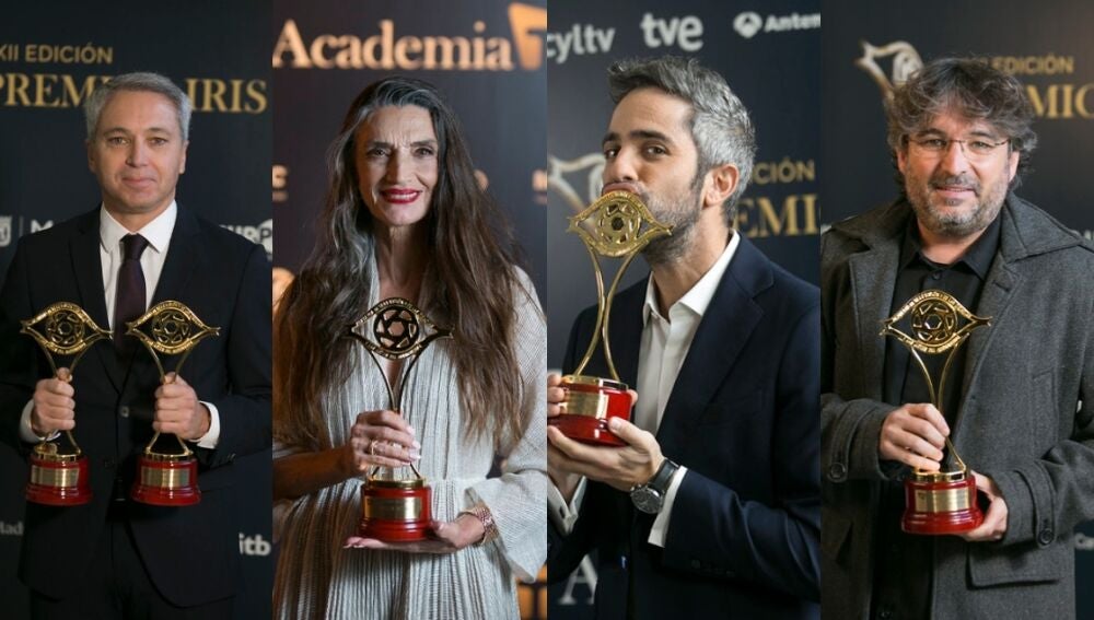Los ganadores de los Premios Iris 2020 y 2021 han posado orgullosos con sus premios tras la gala de entrega de los galardones de la Academia de Televisión.