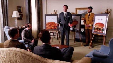 La agencia publicitaria David Miami ha decidido rescatar esta idea que apareció en 'Mad Men' y van a comenzar a publicar en distintos medios las tres imágenes que expuso Don Draper, una hambueguesa, un filete y patatas fritas, a las que sólo les falta el ketchup.