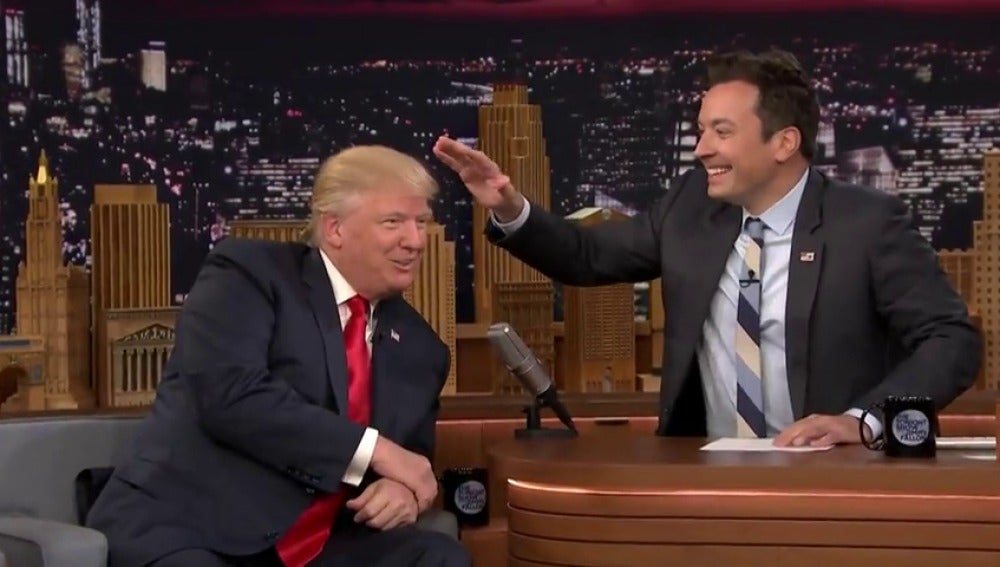 El candidato republicano a la Casa Blanca, Donald Trump, acudió a 'The Tonight Show' de NBC. Jimmy Fallon se atrevió a preguntarle si podía despeinarle y, ante su sorpresa, Trump accedió. No te pierdas el momento en el que Fallon se atreve a tocar uno de los peinados más mediáticos del momento.