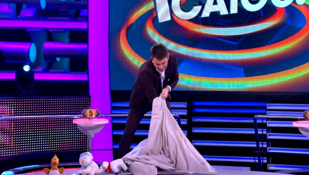 Arturo Valls ha comenzado '¡Ahora Caigo!' desesperado por conseguir meter el edredón dentro una funda. Parece ser que al presentador le ha tocado cambiar la funda del edredón del camerino que comparte con Juanra Bonet. ¿Conseguirá meterlo en la funda?