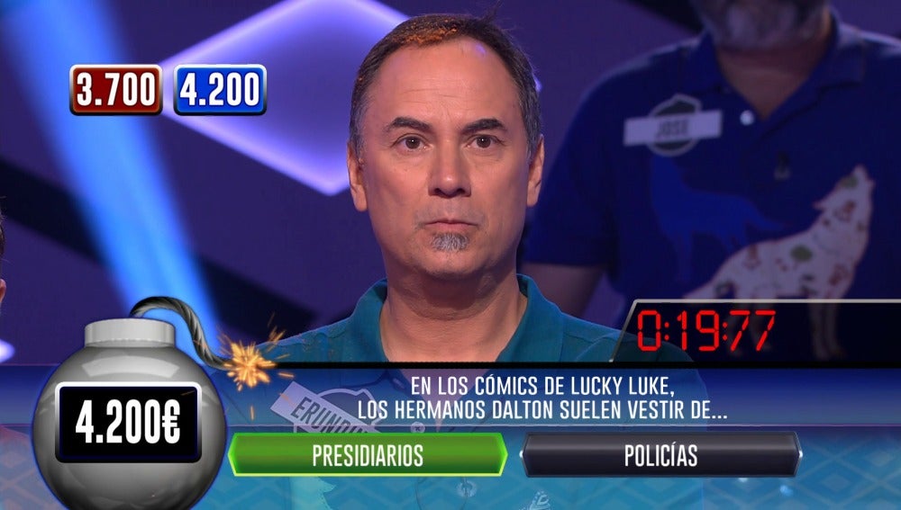 El equipo más veterano de '¡Boom!' se ha enfrentado a la famosa cuenta atrás. Ante la atenta mirada de José, la bomba ha pasado por las manos de Valentín, Manu y Erundino, el último ha conseguido rescatar a 'Los Lobos' y al final han conseguido sumar 5.000 euros.
