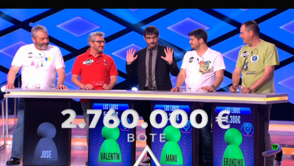 DE LUNES A VIERNES A LAS 20 HORAS 'Los Lobos' continúan luchando por el bote en '¡Boom!' de más de 2.760.000 euros 'Los Lobos' siguen imbatibles en '¡Boom!' y el bote alcanza ya más de 2.760.000 euros. De lunes a viernes a las 20:00 horas en Antena 3, ¡no te lo pierdas! Más sobre este tema: Juanra Bonet los lobos bote boom Boom