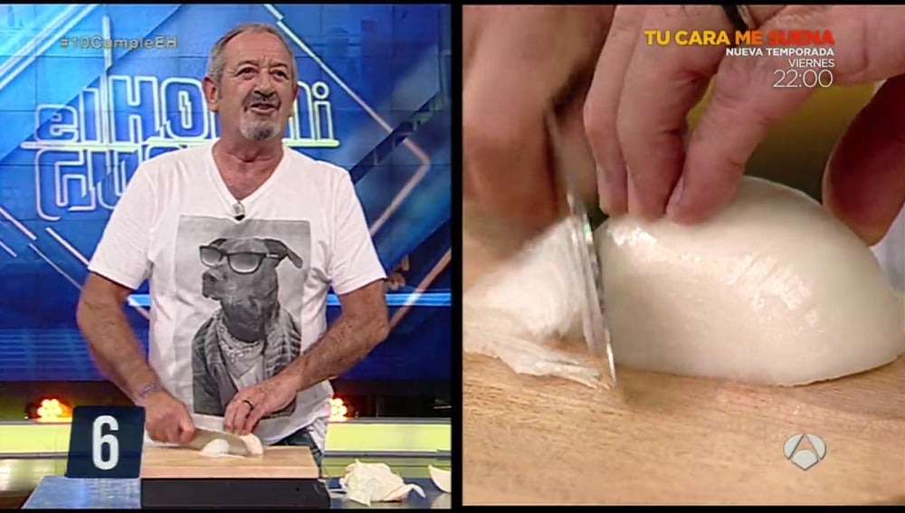 MOMENTOS EL HORMIGUERO 3.0 Karlos Arguiñano corta una cebolla entera sin mirar Pablo Motos ha asegurado que Karlos Arguiñano es el cocinero que corta la cebolla más fina. Nos ha hecho una pequeña demostración de su destreza con el cuchillo cortando una cebolla sin mirar. Más sobre este tema: Momentos el hormiguero Programa El Hormiguero 3.0 Mejores Momentos