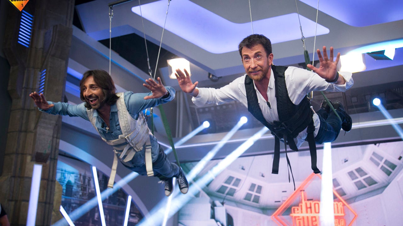 Pablo Motos y Antonio Carmona tocan 'Misión imposible' suspendidos en el aire