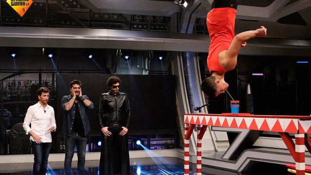 El Hombre de Negro nos trae un curioso reto. Convertir algo tan cotidiano como es beber agua en una difícil prueba. Para ello ha contado con la ayuda de los atletas del club gimnástico de Coslada han tratado de beber agua con una pajita mientras hacen un salto mortal, vaciando poco a poco el vaso. ¡Impresionante!