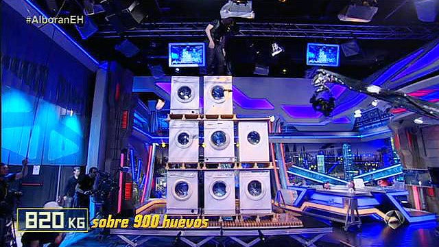 El Hombre de Negro realiza un arte a lo bestia para Pablo Alborán en El Hormiguero. Hemos intentado saber que ocurre si pones 9 lavadoras encima de 8 kilos de huevos con El Hombre de Negro subido encima, en total los 900 huevos tienen que aguantar más de 890 kilos. Mucha tensión en el plató de El Hormiguero ante la azaña realizada por El Hombre de Negro.