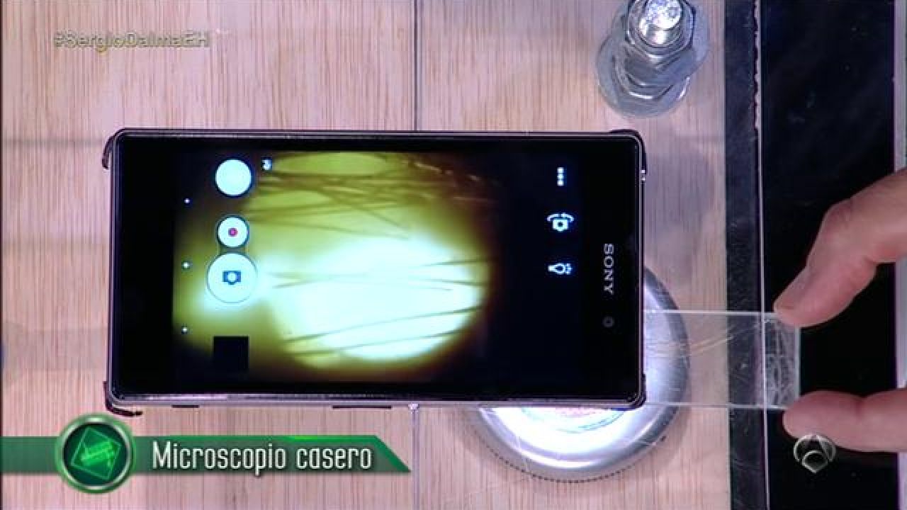 Marron empieza la sección tocando un villancico mediante unos vasos de agua muy acorde a las fechas que se aproximan. Después nos ha enseñado el material polarizador y algunas de sus curiosidades y por último ha creado un microscopio casero con un teléfono móvil y la lente de un puntero láser.