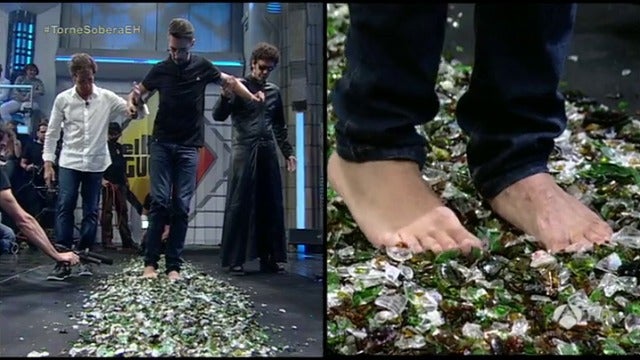 Marron nos enseña como se puede conseguir andar descalzo sobre 1.500 botellas de vidrio reciclado sin cortarse. Y no sólo eso, Marron ha saltado sobre el vidrio sin hacerse ni un solo rasguño. El secreto reside en expandir el vidrio para que la presión sea inferior. Un experimento muy impactante, pero eso sí, esto sólo lo pueden hacer los profesionales, así que no lo intentes en casa...