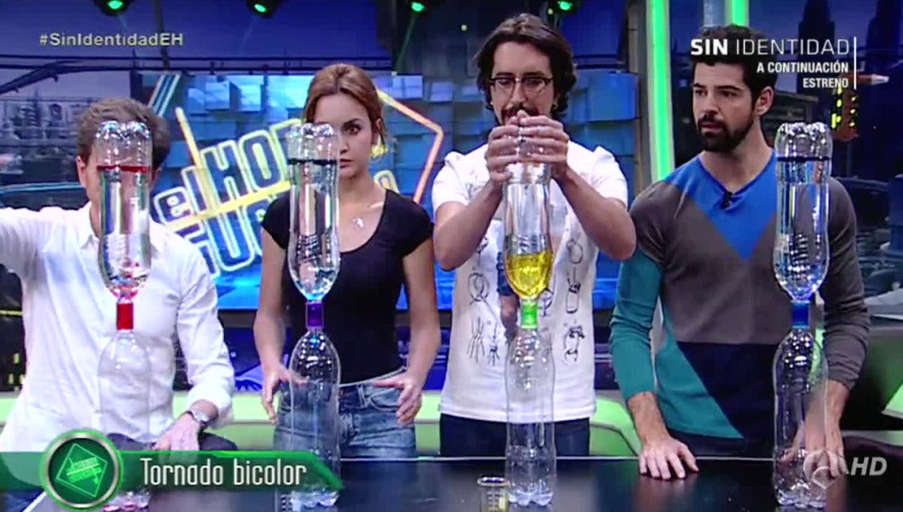 Marron ha probado unos experimentos con Megan Montaner y Miguel Ángel Muñoz en El Hormiguero. Con dos botellas de refresco y un aceite con pigmento el científico del programa de Pablo Motos consigue crear unos divertidos tornados casros, ¿te atreves a probar el experimento?