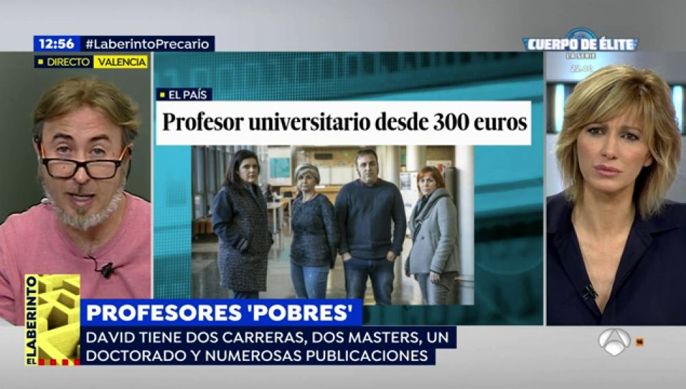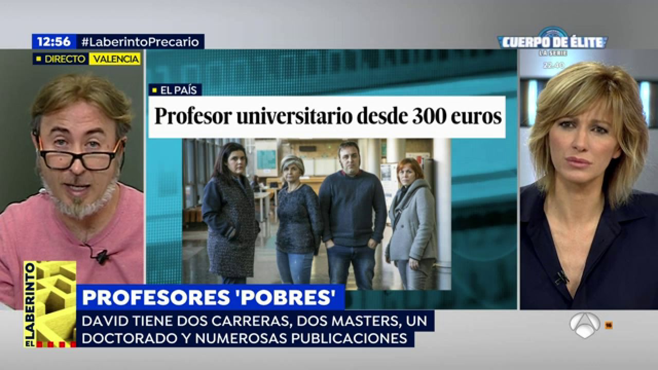 'Espejo Público' ha charlado con David Mascarell, uno de los 23.000 profesores asociados que denuncia un salario paupérrimo. A sus 47 años, tiene dos carreras universitarias, dos Másters, un doctorado y numerosas publicaciones y, sin embargo, sus honorarios en la Universidad de Valencia apenas alcanzan los 500 euros.