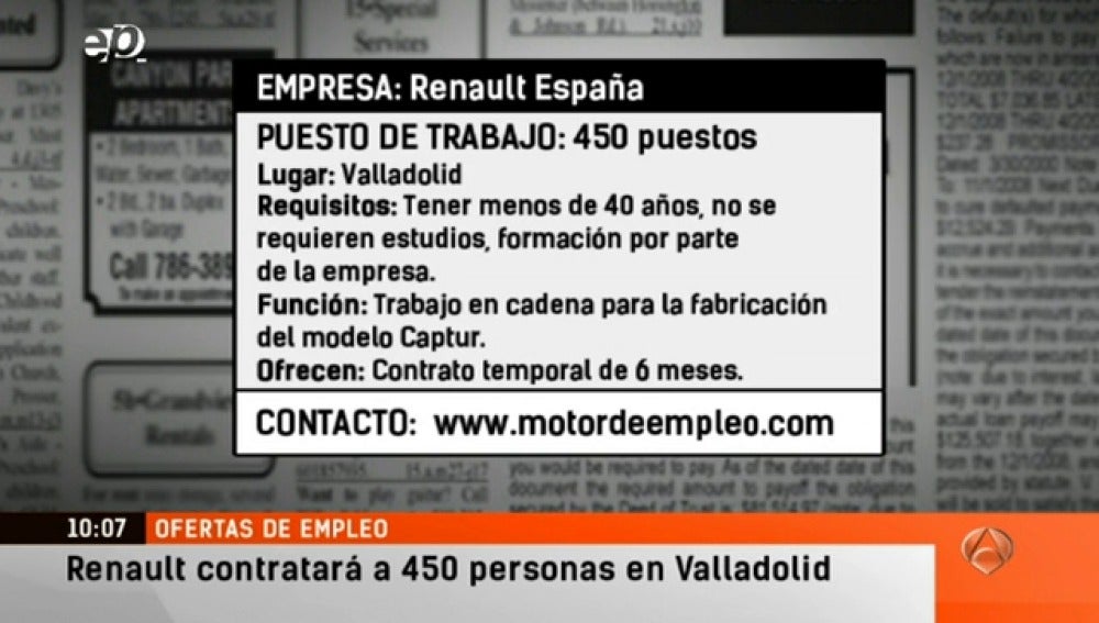La empresa automovilística Renault ofrece 450 puestos para fabricar el nuevo modelo de coche, llamado Captur. Los requisitos son tener menos de 40 años, no se requieren estudios y la formación corre por parte de la empresa. Ofrecen un contrato temporal de 6 meses. Para más información: www.motordeempleo.com