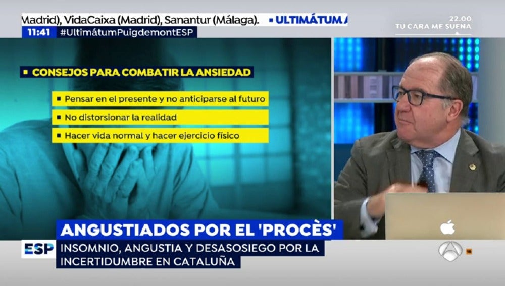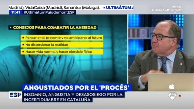 EnCataluña hay un ambiente que está trayendo consecuencias psicológicas, de hecho las consultas psiquiátricas han aumentado mucho y ha bajado el consumo cultural, la gente ha dejado de ir al cine o al teatro. El doctor Fuertes da consejos para combatir la ansiedad, como por ejemplo pensar en el presente y no anticipar el futuro.