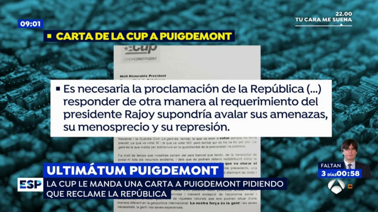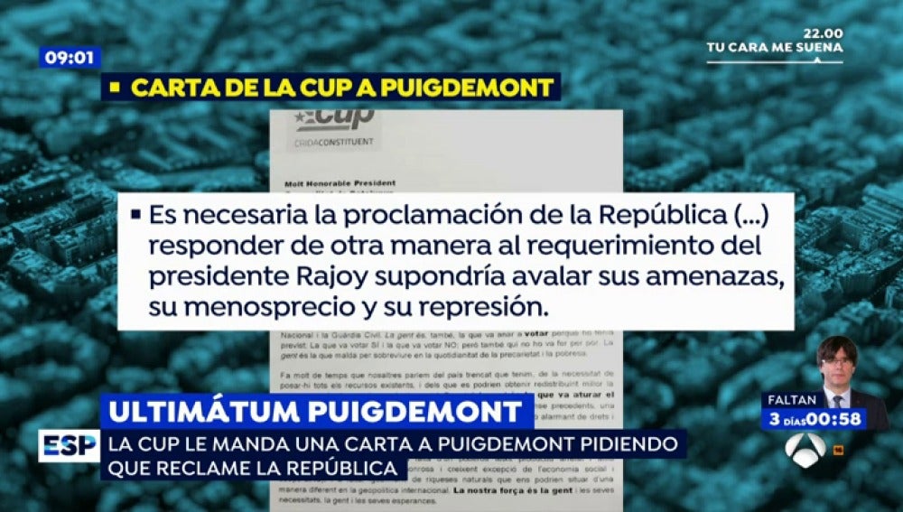 Se trata de una carta enviada este viernes de la CUP al presidente de la Generalitat, Carles Puigdemont. En ella le exige "la proclamación de la República porque consideramos que es la única manera para conseguir que la intervención de actores internacionales se haga con Cataluña reconocida como sujeto político".