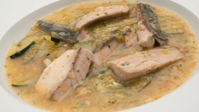 Cazuela de verdel, verduras y tapioca