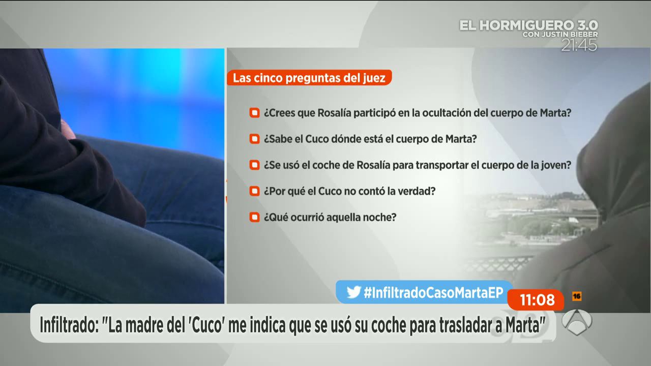 Las revelaciones que espejo público hizo públicas de un infiltrado en el entorno de el "Cuco", el menor implicado en el caso de Marta del Castillo, han removido este caso que sigue abierto desde 2009. Espejo público ofreció en exclusiva las grabaciones que esta persona realizó a Rosalía y Ángel, los padres del "Cuco" y al propio joven. Estas escuchas han desvelado, entre otras cosas, que los padres de "el Cuco" saben más de lo que dijeron en el tribunal que condenó a su hijo por encubrimiento y que, incluso podrían saber el paradero del cuerpo de Marta del Castillo.