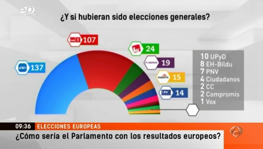 Aplicando los resultados por provincias y la Ley D'hont, la que rige nuestras elecciones, el Congreso de los diputados quedaría ingobernable si se extrapolaran los votos de las elecciones europeas a una generales. Aunque los populares continuarían como la mayor fuerza parlamentaria también sería la que más perdería, casi medio centenar de diputados (186 a 137) frente a los 3 que se dejaría el PSOE, aunque marcaría también un mínimo histórico. Una debacle a favor de los partidos pequeños como Izquierda Unida que sumaría 13 hasta los 24, los 19 con los que aterrizaría Podemos o el resto de formaciones que sumarían 63 escaños y dejarían una cámara muy fragmentada que dificultaría las mayorías formando un Congreso ingobernable.