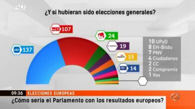 ¿Qué pasa si extrapolamos los resultados de las europeas a unas hipotéticas generales? Hablamos de un Parlamento ingobernable lleno de pequeñas fuerzas políticos. Solo sería viable si se produjera un pactoentre el PP y el PSOE.
