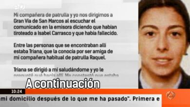 "Mi compañera de patrulla y yo nos dirigimos a Gran Vía de San Marcos al escuchar el comunicado en la emisora diciendo que habían tiroteado a Isabel Carrasco y que había fallecido. Entre las personas que se encontraban allí estaba Triana, que la conocía por ser amiga de mi compañera habitual de patrulla Raquel. Triana se dirigió a mí saludándome y yo le pregunté qué hacía allí. Me constestó que estaba con su madre, que había ido a comprar unos pasteles y que las habían parado junto a su vehículo. Acto seguido sacaron de un coche patrulla a la madre de Triana. Un agente de policía nacional le preguntaba que donde había tirado el arma. Como la mujer no respondía, se dio la orden de que todas las patrullas que estaban en la zona buscaran por los alrededores un arma de fuego.